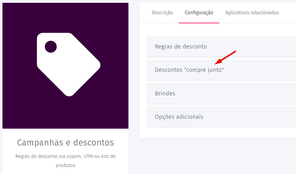 1.3 Clique em Configuração e depois acesse a seção Descontos “Compre Junto” para editar.