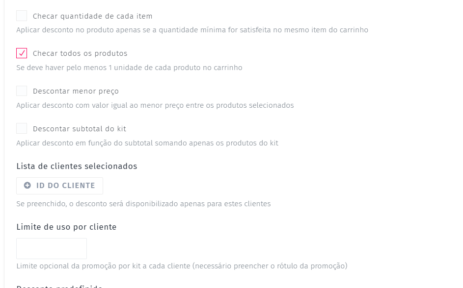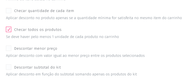 - Mantenha a opção Checar todos os produtos selecionada para ativar o desconto crescente conforme o número de produtos.