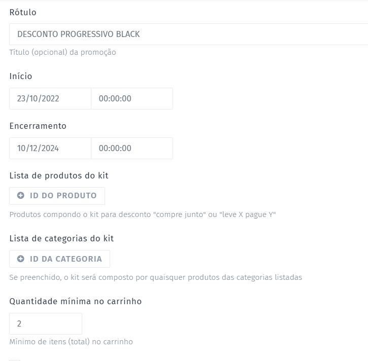 Se desejar aplicar o desconto apenas em determinadas categorias, insira os IDs das categorias.