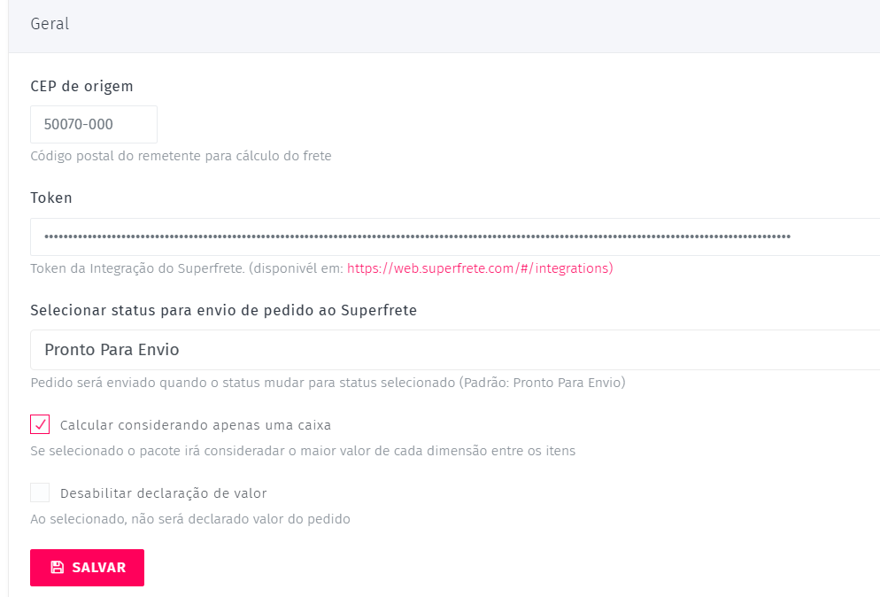 - Desabilitar declaração de valor: com essa opção selecionada, não será declarado o valor do pedido na cotação do frete.
