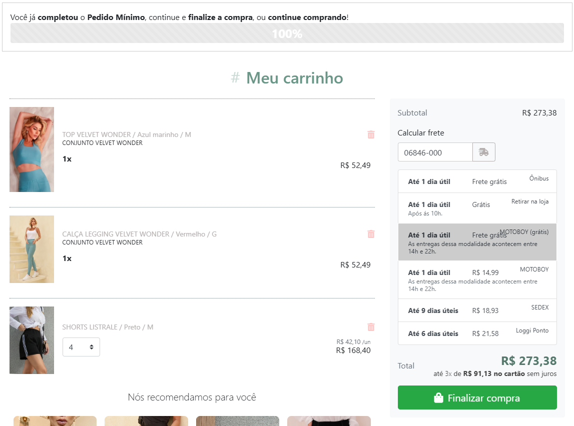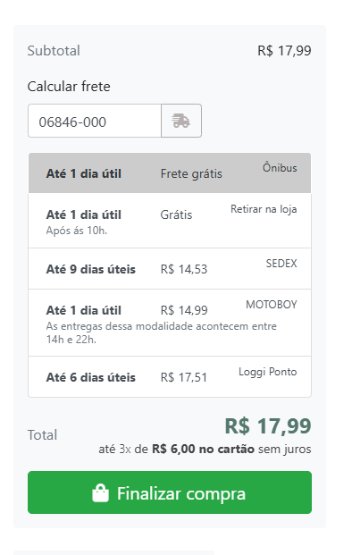 Essa calculadora com mensagem “adicione mais x para frete grátis” só é exibida quando não tem nenhuma forma de frete grátis disponível.